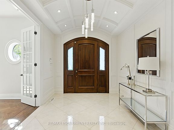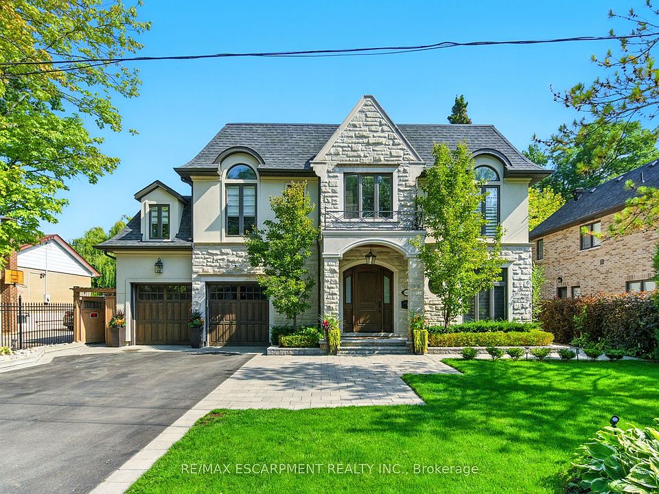 Stunning custom-built home in prestigious Mineola, designed with Feng Shui principles for harmony and timeless elegance. Set on a quiet, tree-lined street, this residence features a striking stone and smooth stucco exterior, legal parking pad, and a two-car garage. Inside, soaring ceilings, custom mouldings, and elegant wainscotting set a refined tone. The main floor includes a private office with built-ins and a formal dining room. The chef's kitchen boasts quartz counters, marble backsplash, Sub-Zero fridge, Wolf gas range with grill, and Miele dishwasher. Open-concept family room with coffered ceilings, stone fireplace, and custom lighting flows into a sun-filled breakfast area. The show-stopping Four Seasons sunroom features floor-to-ceiling Magic windows, skylights, and its own gas fireplace creating a year-round retreat. Upstairs, the primary suite offers vaulted ceilings, a spa-like ensuite with steam shower, heated marble floors, and a custom walk-in closet. All additional bedrooms include private ensuites with heated floors; one features its own balcony. The beautifully landscaped backyard is a private oasis with a heated saltwater pool, composite deck, and mature trees. Located minutes from top schools, lakefront parks, dining, and boutique shopping, this home delivers luxury, comfort, and convenience in one of Mississauga's most coveted neighbourhoods.