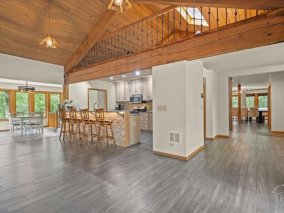 Welcome to your own private retreat! Owner hates to leave this 5 bedroom, 5 bathroom serene gem nestled on 7 acres of wooded land, yet close to everything. This is the most versatile home! First floor primary suite with windows overlooking your own paradise, custom closet full of built-ins and updated bathroom. The kitchen seamlessly opens to a spacious vaulted family room with wood beams, floor to ceiling windows flooding the space with natural light and offering picturesque views of the surrounding nature, and a stone hearth wood burning fireplace. Private fenced paver patio on one side of the family room and sliders leading to a back deck on the other. Dining room can be a library or living room and has its own private balcony. Large laundry room with a utility sink and half bath completes the main level. Upstairs are three generous sized bedrooms, large shared bathroom with double sinks and a quaint loft overlooking the family room. The finished walkout basement is a standout feature, complete with a second kitchen, large living area, exercise area, half bath, bedroom or office with adjacent full bath and second laundry. The property features a 2-car attached garage, complemented by an additional 3rd garage with a workshop accessible from the lower level. The exterior of the property is equally impressive, featuring a newer utility shed with an attached chicken coop, lush grounds, and a small pond. This home offers the perfect blend of luxury, comfort, and nature-your own personal sanctuary. It is truly unique; come and see another way to live a life full of quality and peace. Welcome Home