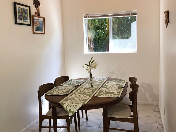 Gorgeous fully furnished newly remodeled apartment on Kaloli Point in Hawaiian Paradise Park. Beautiful apartment on first level of custom built two family home. Separate entrance and parking, lush tropical surroundings ensuring privacy. Excellent quiet neighborhood. Property located at the end of a dead end street, adjacent to large acreage. Apartment is available on a month to month basis. -Spacious open floor plan with kitchen, dining room, and living area -Kitchen/Bath ceramic tile flooring -Brand new flooring throughout -Closet in each bedroom -Window blinds for privacy -Fully furnished including dining table & chairs, King size bed in bdrm 1, Queen size bed in bdrm 2, couch, television, refrigerator -Utilities included, including cable, wifi, electric, gas -Private entrance and separate parking area -Shared laundry room with washer & dryer -No smoking, no candles, no pets -Producing avocado, mango and 'ulu (breadfruit) trees -Landscape professionally maintained