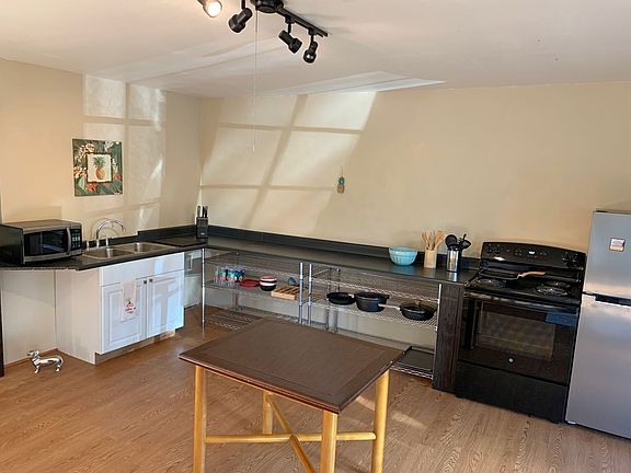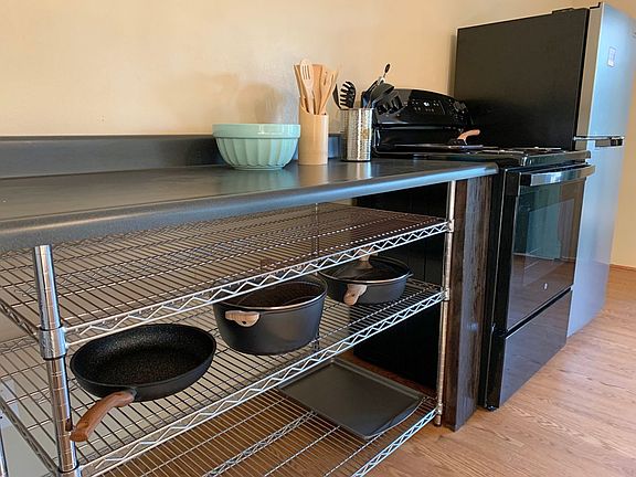 The studio kitchen has plenty of counter space and wire storage beneath with new