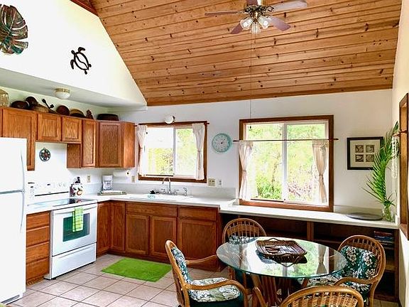 Cool tradewinds will carry the sweet fragrance of jasmine and plumeria through the air as you relax in this tropical garden with bananas, pineapples, guavas and papayas. The Paradise Cottage is a charming two bedroom / one bath home on 1/2 acre of lush lawns and exotic fruit trees. The home is situated in the residential community of Hawaiian Paradise Park, on one of the loveliest bays in East Hawaii - where you can walk for miles and see nothing but pristine coastline and lush forest. Watch breathtaking sunrises and cascading rainbows from the covered lanai. Located 3 blocks from the ocean and just a short walk to dolphin and whale watching. It is a short drive to black sand beaches, waterfalls, hot ponds, restaurants and shops. Designed for relaxation and entertaining the two story Paradise Cottage offers 2 bedrooms and 2 baths. An architectural charmer with comfortable furnishings, a vaulted ceiling and ceiling fans in every room. A custom kitchen comes with all modern appliances. Indoor dining or enjoy outdoor dining on the covered lanai. The ground level bedroom has a Queen bed. There is also a futon couch/sleeper in the living room. The outdoor covered lanai with a dining table and chairs provides a perfect spot for an afternoon siesta. Downstairs there is a shower/ tub in the stylish bath. The living room features open-beam ceilings, a couch, and an entertainment center with Warner Cable TV & WiFi (high speed wireless internet). The open floor plan allows for access to a covered lanai from the rear entrance. The upstairs suite has a King Bed with a full bathroom offering privacy from the ground level. There is a writing desk and chair set. Windows and ceiling fans provide light and fresh air. This is the vacation property for those who want the beauty of old Hawaii. A turnkey property completely furnished including all utilities / electric, WiFi, cable tv, landline phone, water & yard maintenance as well as a washer and dryer. And it is only 20 minutes to Hilo Airport. We assist many groups visiting the island for temporary employment. Please tell us your needs and how we can make your visit pleasuable. Welcome to our Big Island Paradise with all the beauty of Hawaii!