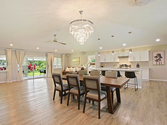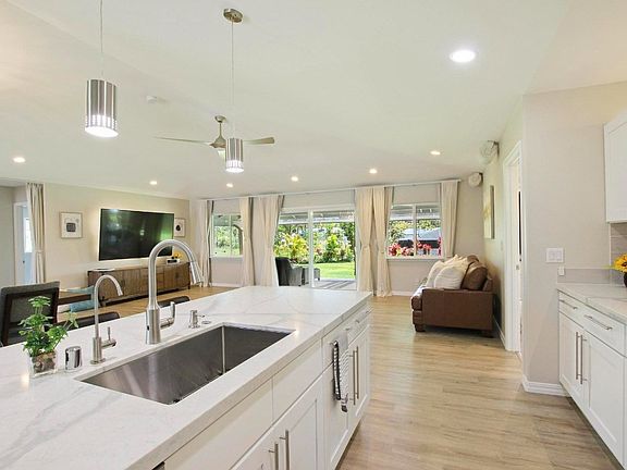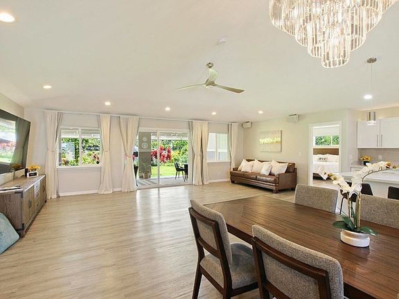 Absolutely Stunning...This modern home is truly impressive with its 4 spacious bedrooms and 3 luxurious baths. From the moment you step inside, you're greeted by one of many standout features of this home, the open living concept, which blends the kitchen, dining and living area into one great room, leading out to an expansive patio. Delight in the sleek design of this island style kitchen, featuring Quartz counters, stainless steel appliances and soft close cabinets. Your oversized primary suite is a sanctuary with a spa-like bathroom where you'll find a soaking tub and a tiled walk in shower. For extra indulgence, relax in your private hot tub located just outside your primary bedroom. Keep cool during our warm summer months with the air conditioning throughout the main living area. Gorgeous landscaping from every view includes native Ti plants, palms, papaya, lilikoi... And for the home gardener, you'll love the raised garden beds and green house, both full of a variety of producing vegetables, herbs and peppers.