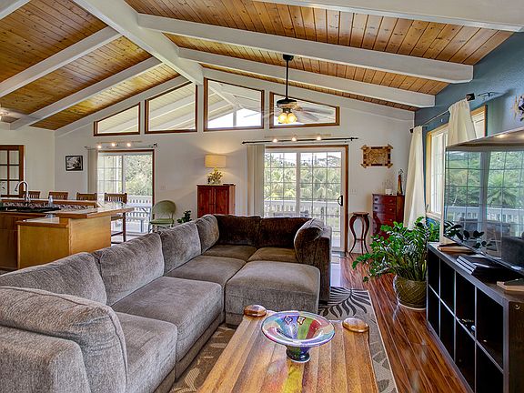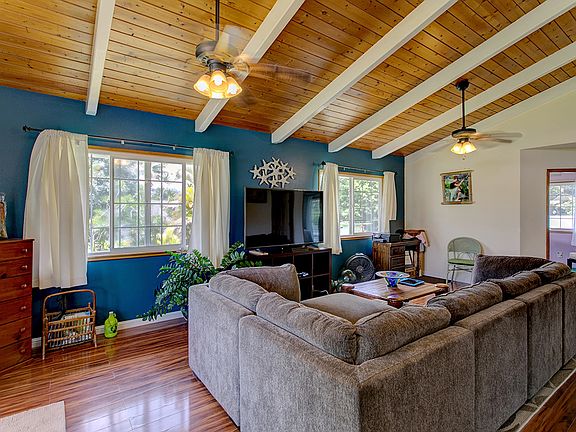 This home offers pine, open beam ceilings, lots of windows for a ton of natural light and sliding glass doors to allow those tradewinds to come right in! The kitchen has a large island that seats 5, a nice sized bedroom with a large, covered lanai overlooking the backyard, an a/c window unit, an office/den that could easily be turned into a second bedroom, and lastly the large, covered lanai that sits off the living and kitchen area which makes gathers simple and convenient, a perfect place to enjoy a beverage and your beautiful yard while you unwind from a wonderful day!