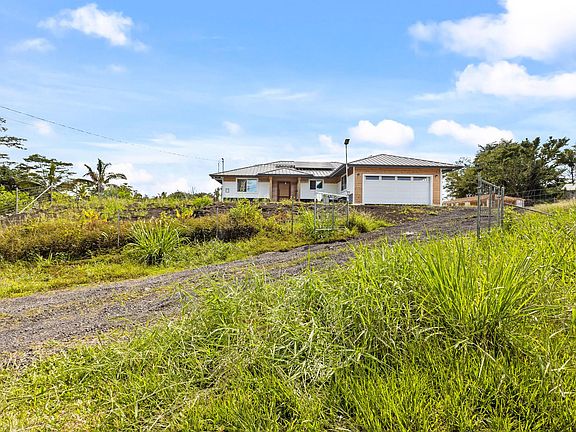 Welcome to 15-1430 19th Ave in Hawaiian Paradise Park, a unique property that sits on 1 acre of land. This home was tastefully built with custom wood paneling featured in the front of home with custom rock work. As you enter your home through the over sized wooden door you will be greeted with an open living and dining area with high 9ft vaulted ceilings surrounded by accent LED lights embedded in the walls and base of your kitchen, bathroom cabinets and vanity. The overs ized primary bedroom offers French doors, a walk in closet with built-in shelving . The Primary bedrooms offer custom stand up showers with his and her sinks , quartz countertops, stylish navy blue colored cabinets with gold accent fixtures. On the other side of the home you have two other over sized bedrooms, another stylish luxury bathroom with tile throughout as well as hydroelectric faucets. This home was not left without the wow! Leading to the back covered lanai is a sliding glass door. On the exterior of the home you will find a clear canvas within a fenced area for one to create their very own space. The home itself was custom wrapped with smart siding and a mix of tongue and groove woodwork.