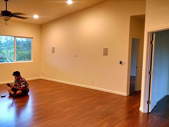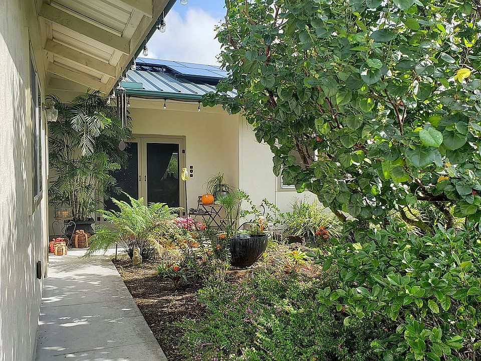Lovely, spacious 4 bedroom (or 3 bedrooms with an office space), 2 full baths, an attached two car garage, with custom built carport extension for added parking space and weather protection, a large pool deck, 24 x 12 oval pool, and a custom built greenhouse with an extensive garden, makes this home a perfect space for a family or the retired life. The home has a small pool house with kitchenette, bathroom, private fenced outdoor shower, and a loft space with room for a king size mattress. The large custom made greenhouse connects to the pool deck on one end and the other leads out to the garden area with six large oversized raised beds. A large toolshed and composting bin add to the gardeners delight. The two car garage has access to an open attic space for extra storage. The home features solar panels to supplement your energy needs and has available batteries to store energy for night time energy needs. In addition, the carport features a a 220w electric charging port for charging an electric vehicle. There's split duct AC throughout the house and energy efficiency magnetic driven ceiling fans. The attic is fully insulated and the roof ridge has a protected air vent to allow hot air in the attic space to escape, further reducing your cooling needs in the home. A brand new, high end water proof laminate wood flooring was recently installed throughout the home, making it suitable for all uses and impervious to spills and high humidity environments. The laundry room adjoins the garage entrance acting as both a mudroom and laundry room, has a large pantry, sink, and newer model front load washer and dryer. The extensive lanai spans the rear of the home, allowing for ample space to lounge, barbecue, entertain and enjoy the cool trade winds in the shade. The home sits on an acre and has a custom made rock wall at the entrance. The driveway is gated with a custom made aluminum gate that has full power from the house allowing for additional lighting to be placed at the gate and other features like a call box. The home has a complete security system, including outdoor cameras, although the neighborhood is quiet, and our neighbors are all very nice people.