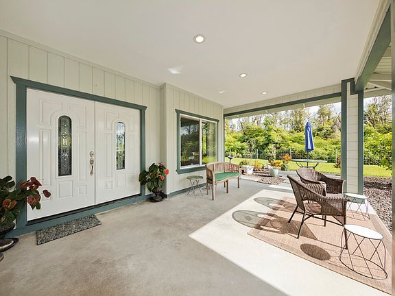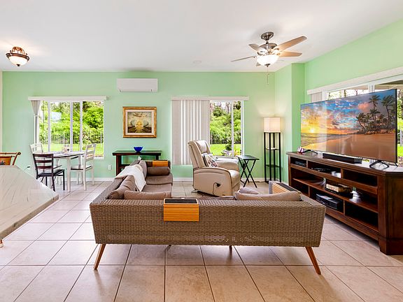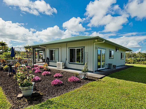 Well-kept home with several improvements inside and out, 3bd/2ba home in HPP priced to sell with AC !! This beautiful home sits on an acre lot that is fully fenced with long driveway as home sits back off the road and also features paved sidewalks surrounding the entire home. The home includes granite counter tops, ceiling fans in every room to include berber carpet for each room, with ceramic tile flooring throughout the rest of the home. Renovated kitchen also features stainless steel appliances and custom wood cabinets. Large covered front entrance and lanai to enjoy the out doors and refreshed rock garden. Large 10K gallon catchment tank also installed in open mature landscaped backyard.