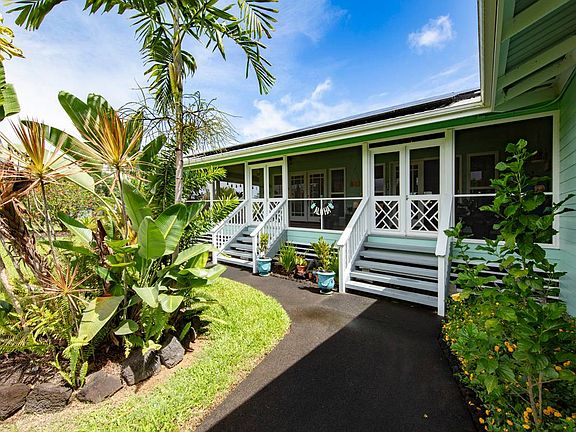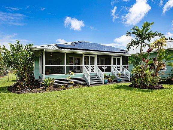 This is the quintessential Hawai’ian home! Conveniently located on the paved side of 19th & Kaloli this HPP gem is peaceful with cool breezes. This three-bedroom two-bathroom stunner can be your own tropical paradise. With over 3,000sqft. under a new roof (2021) you have plenty of room for the entire ohana. The quality of care & attention to detail standout & shine. From the screened wrap around lanai take a moment & notice the view of the lovely front gardens & pineapple patch! Inside, the open floor plan & split wing design are sure to keep everyone happy. The beautiful vaulted ceiling connects the living room & dining room to the expansive kitchen area. Matching stainless steel Kitchen Aid appliance, a large center island, & pantry are all perfectly placed to make this the ideal dream kitchen. The entire home has new plank style laminate flooring. The spacious primary suite has a large walk-in closet, oversized custom tile shower, & a large jetted tub. Imagine stepping out to swim in your new 28ft. pool. The pool area is not only inviting, it also provides a sweeping view overlooking the oasis of your backyard. There's a large variety of local Hawai’ian foliage & fruit trees see addendum for list. At the center of the lush landscaping is an impressive monkey-pod tree with a custom-built treehouse as the focal point. Thanks to Net Metering & a 38 panel PV system you don’t have to skimp on using the wall A/C units in the bedrooms & the “Kick Ass” brand fans in the living areas will always keep you comfortable. There is a 10,000-gallon catchment tank which includes multiple filters & a UV light system. There's a large indoor laundry room plus an over-sized two & a half car garage with a bank of cabinets & an extra storage room. The house is wired with an ARLO alarm system that requires a subscription. The entire acre comes fully fence with an electric gate opener, an extra stand-alone freezer & SCAG lawn mower included in the list price. What more could you ask for?