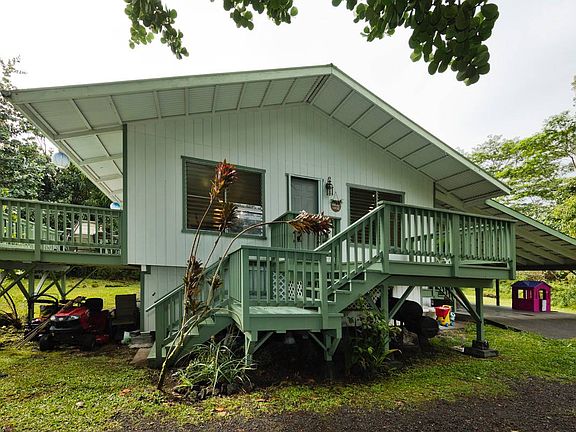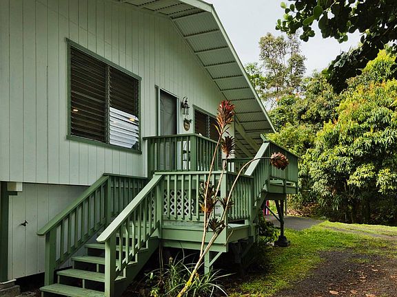 Cozy home on paved road conveniently located in the middle of HPP. This three bedroom two bathroom charmer is solid with good bones also updated since being built. New ceiling fans, recessed lighting and switches add modern touches.  Your spacious kitchen boasts new appliances, (less than six months young) and provides you with plenty of room to make and serve your favorite meals. There is a beautiful large island that provides storage and seating. You can host your entire ohana by using the dining space adjacent to the kitchen or eat outside on the lanai through the kitchen sliding glass door. The large family room rolls right into the kitchen making this open concept living space feel huge. Indoor laundry is a breeze with newer, stacked space saving washer and dryer (2 yrs old) also included in purchase. A cement catchment tank will stand the test of time and can also be used as an extra outdoor living space if covered. This one acre property boast several mature mango trees, a variety of avocado trees, guava trees and some pineapple plants as well. This tropical oasis of land is lush with a sampling of native plants like ti, fern, wild orchids, pikake, ohia, hibiscus and palms ranging from areca to samoan coconut. To top it all off there is an enclosed storage space at the rear of the covered double carport as well as an additional outdoor stand alone storage unit. All these features make this a wonderful place to call home. There are not many "move in ready" homes in HPP for $425,000 with this much to offer.