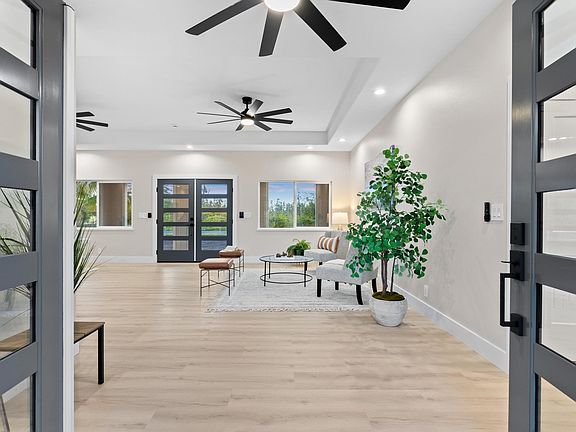 Custom Split Floor Plan offers privacy and flow with 2,700+ sqft of indoor-outdoor under roof space, including a 2-car garage. Home offers a fantastic space for entertaining, extending through sleek French doors to an inviting outdoor lanai.