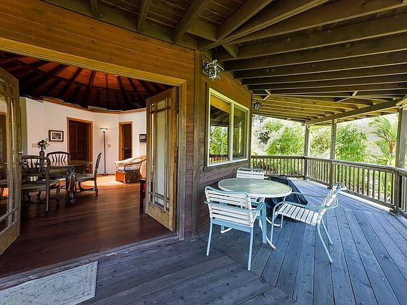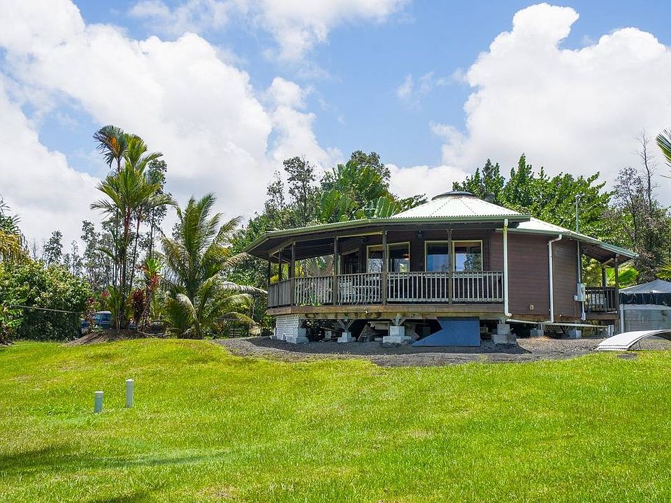This is an opportunity to own a unique Dodecagon style (12 sided) multi-facetted home near the bottom of Kaloli Dr. in Hawaiian Paradise Park, and, it's fully furnished! Great craftsmanship was put into the cedar and redwood exterior which includes a wrap-around deck perfect for enjoying the breezy trade winds. Stepping through the double entry doors, you will notice the openness created by the high ceilings and central skylight. The floors and kitchen cabinets are Cherry Wood, and, the kitchen features granite countertops as well. The bedroom area offers a comfortable living space and opens to it's own private balcony. The bathroom which has two entry ways, also serves as the laundry area. A unique feature of the bathroom is the shower tiles which are petrified wood stone quarried in Brazil. There is mature landscaping throughout the front half of the property while the back of the property remains untouched and available to use as you see fit. With the Puna Coastline less than 1 mile away, it makes for an enjoyable walk. Alternatively, the Puna Kai Shopping Center is approximately 10 miles away while the Keaau Shopping Center is about 9 miles.