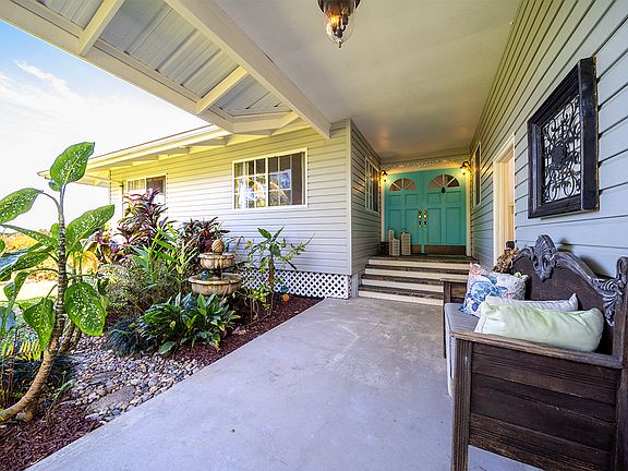 Welcome to this charming 3-bedroom, 2.5-bath home located on a tranquil, paved section of 19th Avenue in Hawaiian Paradise Park. Situated on a lush 1-acre fully fenced property, this home is fully landscaped with tropical palms, trees, and fruit trees, creating an inviting and private oasis. As you enter the property, you'll be greeted by a palm-lined driveway leading to the home, set back from the road for ultimate privacy. Upon entering the home with close to 1900 sf of living area, you'll discover a sunken living room with laminate floors that flow throughout most of the home. The T&G vaulted ceilings create a warm and inviting space. Adjacent to the living area is a cozy dining room that seamlessly flows into a well-appointed kitchen, featuring a unique hardwood countertop that adds character and warmth. As an added convenience the laundry room entrance is through garage.