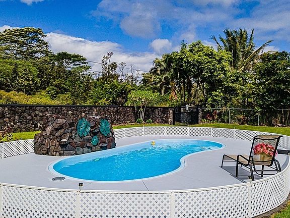 E Komo Mai, your new home awaits...through a gated lava rock wall entry, this property provides amazing indoor and outdoor spaces.  Beautifully renovated, this home features an open floor plan perfect for entertaining family and friends. The large living room flows into the dining area with large windows that let in plenty of natural light. The kitchen has been updated with sleek, modern appliances and boasts plenty of counter space for cooking and meal prep. The large island style counter provides additional storage and doubles as a perfect spot for casual dining. The primary bedroom located on one side of the living area features an ensuite bathroom with a tiled walk-in shower and large closet.  The 2 secondary bedrooms and full bath are located on the opposite side of the kitchen. Step out on to the back lanai with extra covered space and even a built in swing.  The entire acre was leveled and fenced for easy maintenance and lots of room to play.