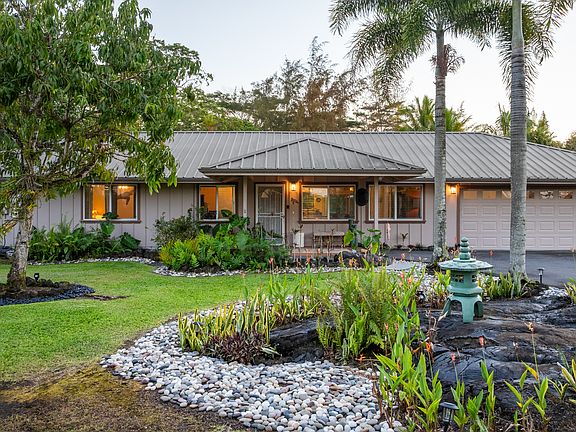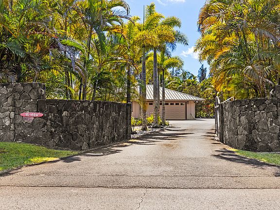 Nestled in Hawaiian Paradise Park, this thoughtfully designed 3-bedroom + office, 2.5-bath is sure to impress from the moment you arrive. Boasting exceptional curb appeal, this home greets you with a gated front rock wall entrance, a paved driveway lined with elegant palm trees, and an array of lush green landscaping.
