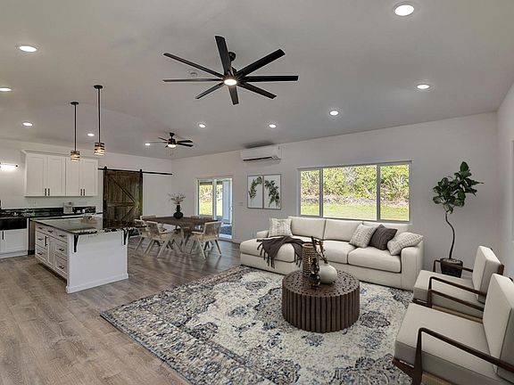 Comfy, cozy, and full of charm. A lot of extra details have been put into this modern farmhouse that sits on an acre of land nestled in Hawaiian Paradise Park. This home has 3 bedrooms and 2 bathrooms with an additional family room that could be used for a home office, entertainment room or whatever your heart desires. The family room has a sliding door that leads to the lanai and open backyard that has 25 loads of imported cinder soil which makes a good foundation to do your landscaping. This is the perfect backyard for entertaining loved ones and your furry friends. Primary suite comes with its own Daikon air conditioning for those days where you just want to lay in bed. Also features a walk-in closet and a barndoor that leads to ensuite bathroom.