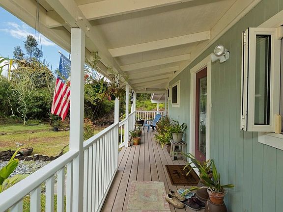 This lovely custom home has so much more to it than meets the eye. The large wrap around lanai adds an additional 1140 sf under roof to the 1416 sf of living space. Every bedroom has a patio door going onto the lanai. The living room doors completely open up and allow the lanai to become part of the homes living space. The house has vaulted ceilings in the living room, dining room and kitchen. The property is approached from a circular driveway with two entrances. The upgraded kitchen is almost brand new and a chef's dream. It features soft close doors, a full corner pull out, drawers in the cupboards, electrical outlets on both ends of the island, double stacked silverware drawers, trash drawer, pantry and there's more. The island even has a sink with second disposal. The master bedroom has two patio doors to the back and side patios. It has a full bath and double closets. The front bedroom has access to the front lanai; the Hilo side back bedroom has a patio door to the back lanai. The home has UV filtration and an indoor laundry area off the kitchen. The yard has numerous plantings including lemons, oranges, tangelos, minneolas, pineapples, avocado, longon, orchids,and coconut palms.