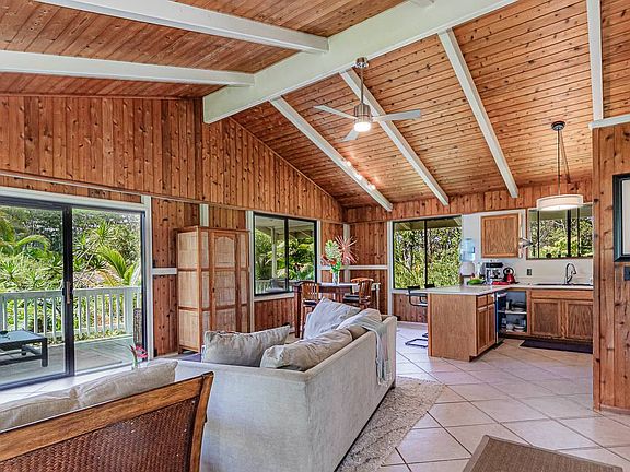 Welcome home! Well maintained, 3 bedroom 2 bath home, on one acre - built on post and pier with a covered lanai and gorgeous gardens! The open-beamed vaulted ceiling in the open concept living, dining, and kitchen area opens to a 208 sq ft covered lanai - the perfect outdoor living space! This home features cedar lined walls with quality tile flooring in the main living room and baths, bamboo and laminate wood flooring in the bedrooms. The laundry area is located in the roomy attached carport with a concrete foundation. This also houses your water system including UV filtration!