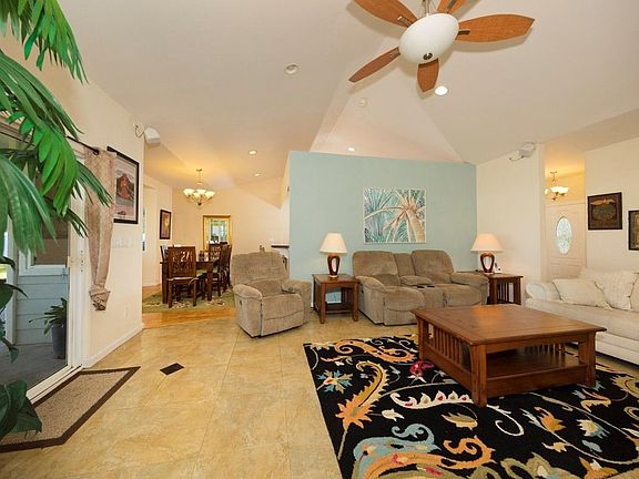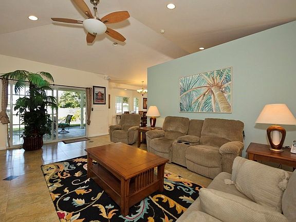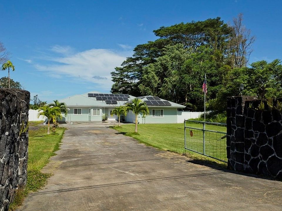 This fantastic property has it all. Located at the top of the subdivision with easy highway access. Rock walls front the property with gated entrance. The home has 35 net metered solar panels on the roof. These are owned by the seller, it is not a leased system. Enjoy relatively inexpensive electricity for your home needs. The large home is on a slab for easy access. There are 3 bedrooms and 3 baths, but also an office/den area in the front that could function as an additional bedroom in a pinch. The entryway has porcelain tiles with glass accents. The vaulted ceilings in the living room open up into the dining, kitchen area. The large well appointed kitchen has a pantry. The indoor laundry room is conveniently across from the kitchen and off the garage. Two bedrooms are found on one side of the house and the master is tucked on the other side for privacy. There is a large screened back lanai off the master. The ensuite master bath is an oasis of escape. There are a shower, jetted tub and double vanities. The master also has a large walk in closet for your storage needs. Did I mention the large grassy yard ready for your dream landscaping and fully fenced back yard.
