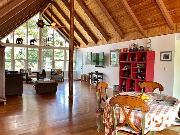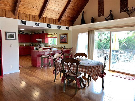 This updated A-frame home features two large master bedroom suites or easily convert second master suite back to two bedrooms. Enjoy Pacific Ocean breezes, and Mauna Kea views. A well designed natural landscape with exotic palms and producing tropical fruit trees....welcome to your Hawaiian dream home!Beautiful features and details include:* Open family/dining room concept with sweeping views of the sunrise and mountains* Master suite has spacious tiled bath featuring "Reed Glass" doors leading to the private side lanai* 2nd master suite has its own private entrance, new toilet, tub and sink* All new, double-pane Jen-Weld windows throughout* Large kitchen with newer appliances and ample cabinets and counter space for cooking and entertaining* Newer bamboo wood flooring* Newer hot water heater, pump and clean water double filtration & UV system* Tiled back deck with iron railings with an extended cement pad and staircase leading to private outdoor shower* Lava rock walls and lava planters hosting beautiful varieties of flowers and shrubs* Fero-Cement catchment tank thoughtfully situated under the lanai - thats correct; no huge round catchment tank obscuring views in this yard* Finished 10x14 shed* Covered carport (440 sq ft) recently painted with storage cabinets and shelving * House purchase includes emergency Generator with hook-up, 220 V hook up* T1-11 for durability* New exterior trim on house and interior & exterior of home painted * Whole House Fan installed in hallway for attic hot air release* Currently under termite warranty, tented in 2016 The outside is botanical paradise with over 100 edible plants, including avocado, bananas, cherry, pommelo, tangerine, lemon, lime, kumquat, tangelo, coffee, fig, turmeric, jaboticaba, jackfruit, lilikoi, mango, mangosteen, mountain apple, papaya, pineapples, rambutan, rollinia, soursops and starfruit. See addendum for full list.