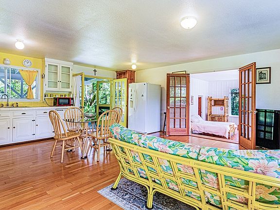 An open concept large kitchen/living/dining room with an eight foot picture window overlooking the front porch and garden with fragrant puakenikeni, acacia, plumeria and palm trees, gardenia and more flowers.