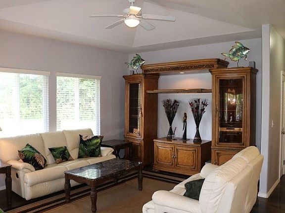 Donât miss out on this one. This house has it all: The private one acre lot is located on a paved road in Hawaiian Paradise Park with clean well-kept neighbors, just a few blocks from the Keaau-Pahoa Hwy. The home is surrounded by puakenikeni, oranges, lemons, ginger, orchids, bromeliads, and Ohia to name a few. The flat, cleared one acre property has an electronic gate to ensure its tropical garden-like retreat is not easily disturbed. The Neil Erickson design has a familiar 3 bedroom, two bathroom layout featuring high ceilings with generous indoor as well as outdoor living space. Kitchen appliances include the dishwasher and microwave with a formal dining area and a spacious living room. There are more than enough cabinets and counter space with an open floor plan for entertaining and enjoyment. The home is less than ten minutes to the dining, shopping and banking of Pahoa and Kea'au, while only fifteen minutes from Hilo â far enough to be peaceful and quiet; close enough to be convenient. This won't last long.