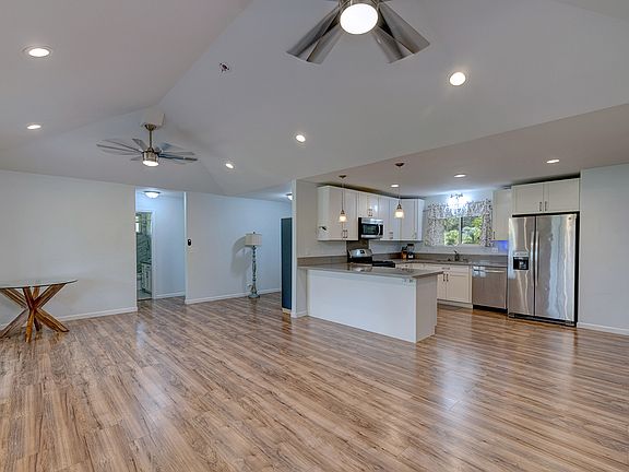 Just like new! this 2019 3 bedroom, 2 bath home on 1.2 acres home with greenery all around it, solar power installed leased through Sunrun, and outside lanai/patio area is screened in too! Open living area into the Kitchen with beautiful finishes throughout including luxury vinyl plank flooring, upgraded fixtures and hardware, soft close cabinetry, solid surface countertops, stainless steel appliances, custom tile in the bathrooms. Split floor plan with the french doors opening up to the Primary suite bedroom with walk in closet, and ensuite bathroom that has walk in shower and dual sinks.