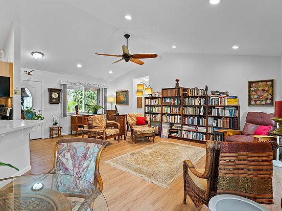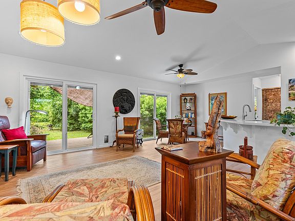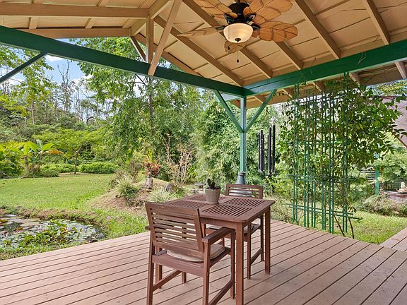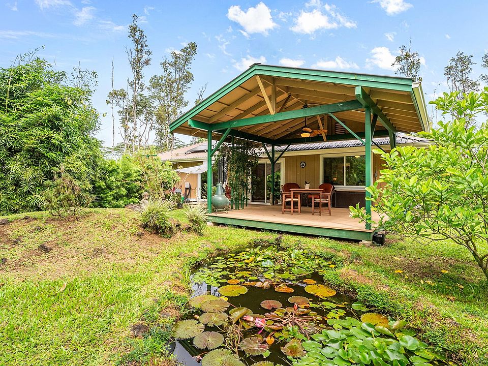 Beautiful 3 bedroom, 2 bathroom home built in 2020, set in a lush, private garden oasis featuring fruit trees, a tranquil pond and a charming lanai. Gorgeous rainbow eucalyptus trees too! Home is situated on 1 acre of land with a concrete driveway and located on a paved road.