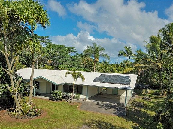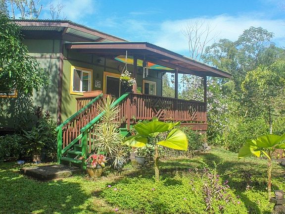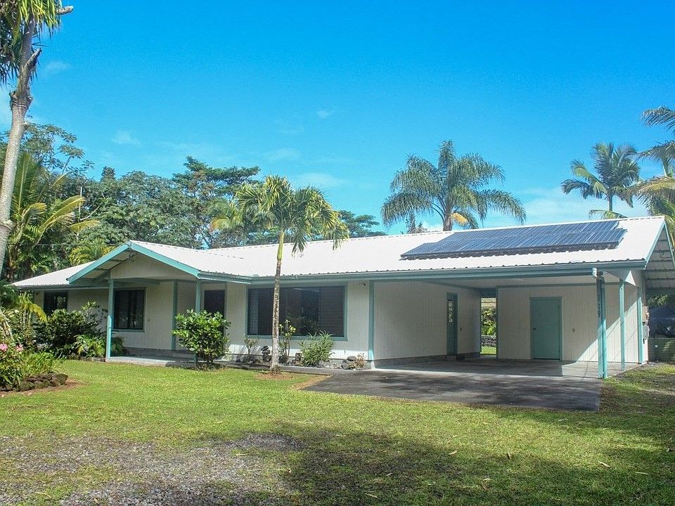 Opportunity is knocking with this terrific 3 Bd/2 Ba home boasting a detached, studio/ohana perfect for guests and extended family, or as a yoga/art studio.Setback from the road, this single-level home offers a nice feeling of privacy, including a long driveway and vegetation buffer. As you pull into the carport, you can choose the side entry, into the dining/kitchen area, or use the formal, front entry into the living room. A large picture window, combined with jalousies, offers a bright, airy living space which flows over to the dining area, with the spacious, L-shaped kitchen set behind a practical dividing wall. The kitchen features ample cabinet space, tiled counters, and bar seating. Glass sliders at the rear of the dining room lead out to a relaxing lanai, perfect for entertaining.Down the hall, you will approach two bedrooms on your left, and the master on the right. The master features double closets with bi-fold doors and ensuite bath w/full tub and tile surround. The main bath also has a tub with tile surround, its own door to the outside, and houses the indoor laundry.Additional amenities include:- Laminate and tile flooring.- Owned, 13 panel, grid-tied, photovoltaic system by Sunetric.- 10,000 gallon catchment w/UV and two-cartridge filter system.- Landscaping w/fruit trees and five, raised beds. (Avocado, Lemon, Lime, Orange, Soursop, Cacao...)- Stone BBQ & fire pit.- Chicken coop.Spread your wings in the adorable post & pier studio/ohana which offers an array of potential (Originally permitted as a workshop/craft room). Quality touches include a stone-laced landing, front and rear lanais, open beam design with drywall ceilings, three ceiling fans, and bamboo flooring. There's also a 500 gallon chemtainer catchment, pump/filter system and on demand, propane hot water heater. The building & electrical in this structure are permitted, but plumbing features were added without a permit.
