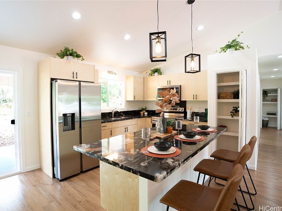 $10,000 CLOSING CREDIT OFFERED! Looking for that 1st home? Rental property? Or just time for an upgrade? Here sits this newly constructed 3-bd 3-ba hm on 1 ac of land in the fast-growing Hawaiian Paradise Park Subdv. W/1286 sqft of living spc, & an addtl 682 sqft of accessory spc, this beautifully designed hm feat titanium granite countertops throughout the kitchen & bathrms; oversized island w/pendant lighting above w/a modern touch for an area to entertain your guests. Laminate flooring throughout the house, & each bathroom custom to allow you to get creative w/your decorative ideas when creating your new space. Your master bedroom incls a walk-in closet w/top shelves, a full bathroom w/large stand up shower, tiled w/exquisite patterns. The addtl bdrms are standard 12x10 & LR inclds an open ceiling concept which leads to the back covered Lanai. Some upgrades that are incld w/this hm is a rock wall in the frontal portion of the lot, a fence that runs perpendicular to the house which has a gate wide enough for a large vehicle to pass through to the back portion of the home. A little over a half an ac is cleared, leaving the back part of the prop lush w/vegetation for extra privacy.