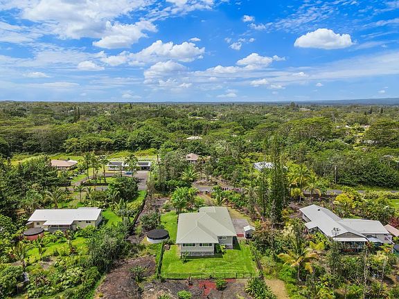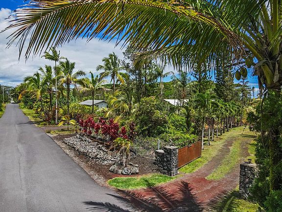 Experience the best of Hawaiian Paradise Park with this centrally located custom home on a peaceful dead-end PAVED street. The property welcomes you with a stunning custom stone and copper gate equipped with an automatic opener. Step inside to discover a home featuring new luxury vinyl plank flooring and beautifully tiled bathrooms.