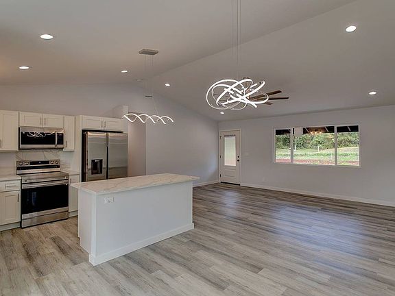 Spacious and bright open concept floor plan with vaulted ceilings, soft closing cabinetry, solid surface counter and island, vinyl flooring, ceiling fans, beautiful hardware and light fixtures throughout the home.