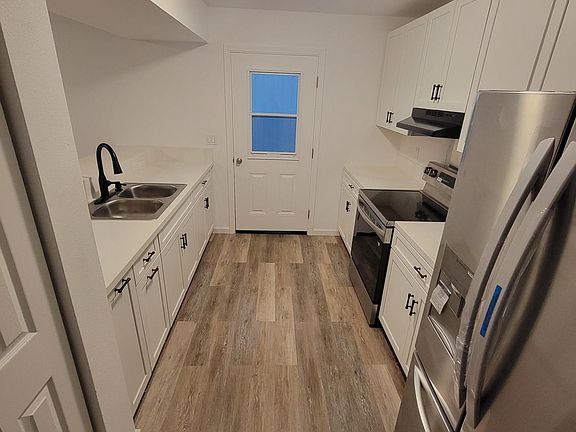 New refrigeratorNew stoveBeautiful gardenNew appliances and cabinets