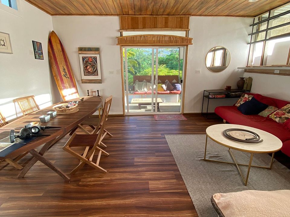 Artists' retreat with two airy bedrooms, a view loft, a broad tradewind-facing ofuro-holding lanai, an intimate north lanai, a swing in the west tower, and a south lanai for bbq and parties. The main living area and island kitchen are unique tropical modern style by the award-winning architect/owner. Solar hot water, digital propane cooking, new reefer and Cuisinart microwave, fully and artistically furnished. Unique and relaxing. Month-to-month rental.