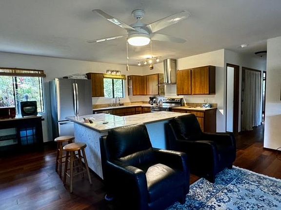 Fully furnished home in HPP. Move in now. Spacious interior with open kitchen. Landscaped yard. Enclosed garage with additional carport for parking. Front gate to add privacy. Only minutes drive to Kea'au and Hilo.