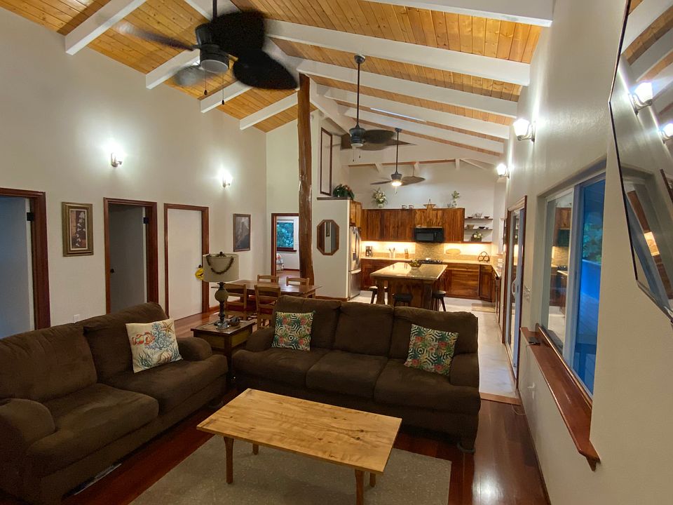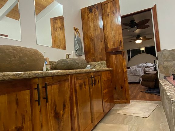 We are offering an amazing new house. This custom built home spares no details. Full of custom woodworking made with lots of love. It is fully furnished and has three large bedrooms and two full bathrooms. The master bedroom is extra large and has a California king bed with an en suite bathroom that has his in her sinks, extra large, custom shower and a two person Jacuzzi tub. The second bathroom also has his in her sink with a tub shower. The extra large kitchen opens to the living room with Open beam ceiling there is tons of space. There is a 8 foot wide deck on two sides of the house they spectacular double doors made out of Koa wood. All the cabinets throughout the house are also solid Koa wood. There is a large two car open garage downstairs with washer and dryer this house is so complete. You will not be missing anything. It is situated on a beautifully landscape 1 acre property in Paradise Park Looking for a minimum of one year lease, utilities are not included, first and last month possibility of last month being split within two to three months. There is a strict no smoking in the house rule. Renter is responsible for maintaining the yard, (yard service available ) keeping the house in Prestine condition, for example clean and no damage.