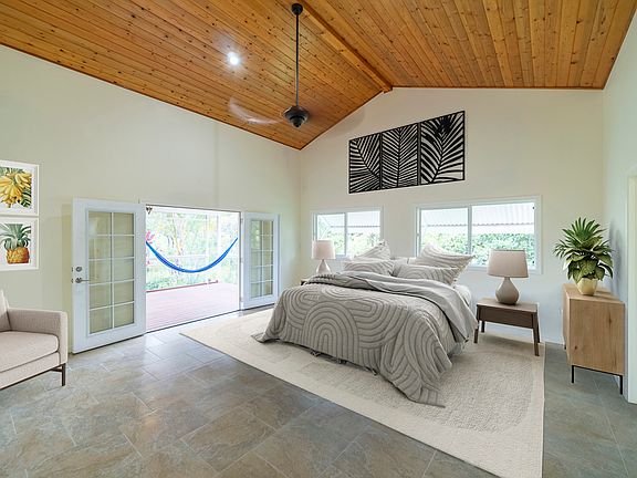 The gigantic master bedroom is positioned across the living room from the two additional bedrooms, providing for optimal privacy. French doors open onto the lanai, and the ensuite master bath includes a huge walk-in closet. Across the living room, there is a locking glass door that can separate the master bedroom and primary living space from the 2 additional bedrooms and guest bath, allowing for a separate living area, rental, or many other options! The guest bath includes a jetted tub, and the second bedroom even includes a kitchenette with apartment sized refrigerator. Out the back door, there is an additional covered lanai, and over 600 square foot covered carport. The home boasts grid tied solar with battery backup, solar hot water, and even a well (no catchment needed!).