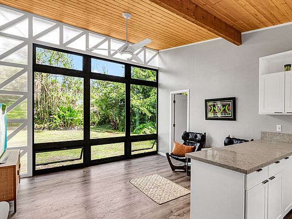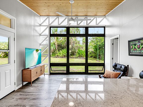 Enjoy excellent construction in an off grid one bedroom 460 square ft. single family home, connected by a shared laundry room and 240 sf lanai to a 240 sf ‘ohana, on one private acre. Off grid features incude a 6000 watt all in one inverter, and a 10 kilowatt wall mounted lithium ion batteries. All spaces include tongue and groove wood ceilings with LED lighting. Long, winding drive through shade trees to the cleared and private home site. Floor to ceiling windows look at a thoughtfully landscaped tropical environment with a large producing lychee, ‘ulu, hala, lemon, lime, orange, coconut avocado, palms, bamboo, Kukui nut, heliconia, shell and torch ginger..