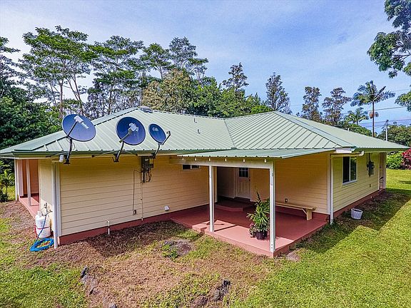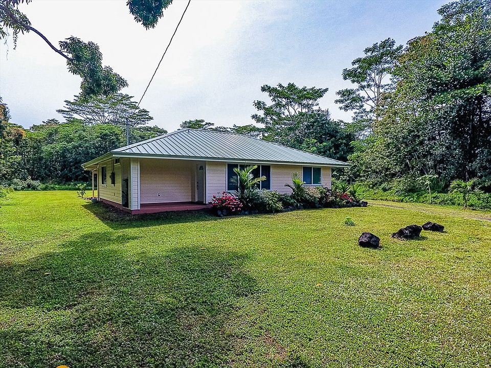 This charming split bedroom home is set back from the road, nicely situated on the landscaped lot for easy living with several outdoor spaces to enjoy the weather. Live green with an electric car changing port and catchment water and on demand water heater. Beautifully maintained single family home with 1308 square feet of living space and an additional exterior front and back lanai has a huge carport opening onto a laundry and utility room, and can be used as a lanai or covered living space. Situated on 10th Avenue in the "banana belt" of Hawaiian Paradise Park.Additional features include:Open floor plan with vaulted ceilings in living/dining area.Kitchen has birch and eucalyptus wood laminate.Spacious master suite with sliding doors to outdoor lanai opening onto back and side yard.Walk in closet in master suite, double sinks in bathroom, tub and shower.Two additional light and airy bedrooms on the opposite side of the house for privacy.Fruit trees and herb garden, grassy lawns throughout, papaya, avocado and mango trees.50 amp 220 stage 2 electric car charging port in open carport which looks onto the side and back yards.On demand water heater system.Top of the line UV filtration system in enclosed room off carport with full sized additional Whirlpool refrigerator/freezer.10,000 gallon catchment tank with food grade liner, gutters freshly cleaned.Separate laundry room with Maytag washer and dryer units and laundry sink.Insulated attic with attic fan.Cement LP siding, 2 by trim on sills, fully sheeted underlayment.Exterior LED lighting.Pressure washed and maintained, freshly painted exterior within the last year and a half.Lava Zone 3! No extra insurance premiums.Owner occupied, please make appointment with your Realtor to see, overnight notice requested. Was in escrow dependent upon the sale of the Buyer's property, which fell through. This property is ready to show!