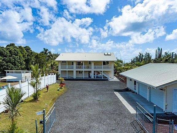 A beautiful, fenced-in concrete pool with water features was installed when the home was built in 2019. The basement of this home bonuses as extra living space as well, this could be great rental income! This home is not your cookie-cutter new build, the large lanai makes great use for entertaining or simply soaking up Keaau's great weather.