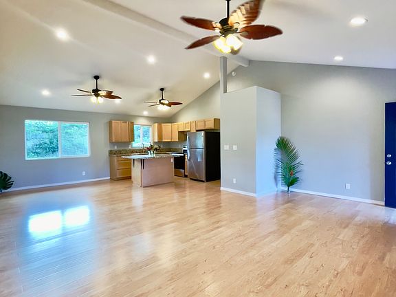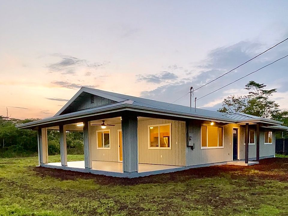 This 2021 build is move-in ready for you now! A covered porch greets you upon entrance as you walk into an open-living floor plan. Lots of natural light, vaulted ceilings, consistent fixures, and recess lighting throughout the home really brings plenty of grandiose touches! The kitchen features plenty of storage and a counter space with a large island. Enjoy evenings dining alfresco or watching the sunset on the spacious covered lanai that boast views of both the back and the front yard. Built recently, this home also features consistent granite countertops in kitchen and bathrooms, large double sink in kitchen, solar powered hot water (2 panels), coffered ceilings, double-pane windows throughout home, soft close cabinets and drawers in kitchen and bathrooms, laundry room with new washer and dryer included, and much more! Large galvanized water catchment with UV filtration system. Save on future cesspool conversion cost as this home has a septic for wastewater. K-1 Staking will be provided. The master bedroom has his/her closets and an on-suite bathroom. Additional bedrooms offer great space for family, guests, or home office needs.  This level 1 acre property provides you the opportunity to create your own tropical landscape inside the natural tropical perimeter. Located within walking/bicycle distance to oceanfront parks and walking paths where you can enjoy watching whales, dolphins, and much more! Learn more about Hawaiian Paradise Park (HPP) at https://www.hppoa.net. For your convenience, this neighborhood offers a plant nursery, auto repair, veterinarian, water catchment supply co., food, and grocery delivery. Nearby take advantage of the several farmers markets, as well as new dining and shopping options located in Hilo, Pahoa and Keaau.