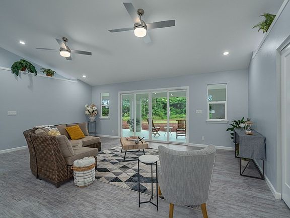 The rear lanai has a cement sidewalk tied to the driveway on one side. There is an additional sidewalk linking the driveway around the garage to the man door. Home features include smart panel exterior siding, vinyl clad sliding windows with wood sills, 5 ceiling fans, recessed lighting, extra storage closets, exterior lighting and rain gutters.