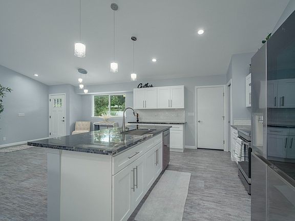The handsome kitchen features granite counters, tiled backsplash, soft close wood cabinetry doors and drawers, 7-foot granite island with stainless steel sink, stainless steel finish appliances, and lighted pantry closet.