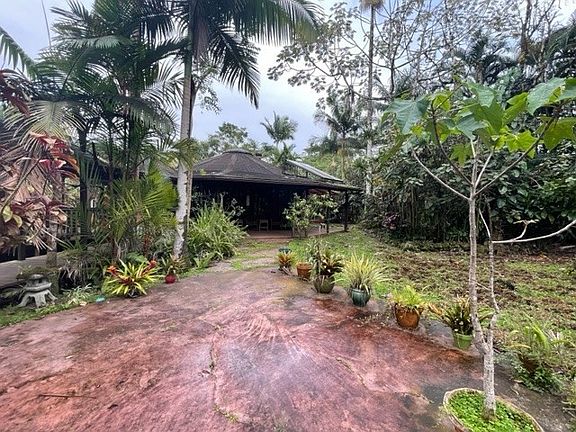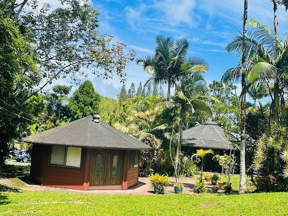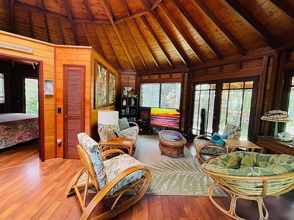 Enchanting and unique tropical retreat is truly one of a kind! TWO one bedroom, one bath redwood and cedar pods built in a unique almost Balinese style, connected by covered walkways, with 2 wonderful decks and additional concrete covered patio off main living area. Gorgeous open beam ceilings with skylights, fabulous custom doors, windows everywhere for a light, bright cozy living area. Tropical furnishings are negotiable- care to move right in? The entire acre lot is usable and lovingly landscaped with lawns, tall palms, ti plants and ginger. Bonus approx 10X18 Shed serves as workshop and storage. Some deferred maintenance, sold As Is. Totally private from the road and ideally situated on a dead end street with very little traffic. Must see to appreciate this truly special property.