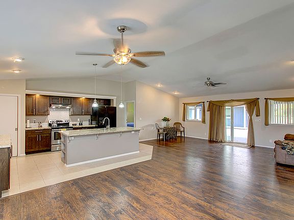 You enter the home into the comfortably sized main living area of kitchen, dining and living room. Here you will find vaulted ceiling, a dining area which can accommodate a table for 6 or more, and access to the back covered lanai. The kitchen has an island with bar seating, stainless steel appliances and beautiful wooden cabinets. Conveniently there is an entrance into the kitchen directly from the garage.