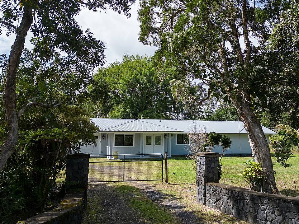 Fully remodeled with quality work 3 bedroom, 2 bath home on a full acre of land, located in Upper Hawaiian Paradise Park with quick easy access to the highway. Home features an open floor plan with a large island, ample cabinets and counter tops, open living room and dining room with a double door entrance. Walk in pantry, and large wash room with glass doors to the outside lanai. Master Bedroom with walk in closet, ensuite bathroom with dual sinks and custom walk in shower. Guest bathroom and 2 nice size bedrooms. A 2 car garage with a huge storage room, green Lush park like setting with grassy yard and banyan tree.