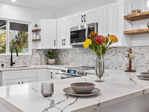 Ideal location on a dead end road that butts up against undeveloped land. Here you will find this modern 3 bedroom, 2 bathroom home. With no through traffic, the location provides minimal noise with an inviting atmosphere. Situated on the front half of a 1 acre parcel with an ambiance filled with landscaped grounds.  This property entails a freshly paved asphalt driveway, a meticulously designed rock garden, and a unique stone walkway that welcomes you home. Inside, the split floor plan balances functionality and practicality. You can’t help but to notice the oversized primary bedroom  which provides ample space and a generous en suite bathroom with a walk-in closet plus its very own closet island. There are additional hints and accents such as tray ceilings in the living room and large windows allowing for an abundance of natural light that flows seamlessly through the living area and into a well appointed kitchen. Included with this home are the necessity appliances and quality finishing. Storage closets are thoughtfully placed throughout the home, ensuring plenty of room for organization. Step outside to the large covered lanai, perfect for enjoying the peaceful surroundings. A UV water filtration system provides clean, high quality water for peace of mind.