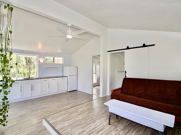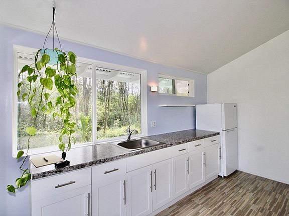 Hawaii life starts with 1 acre of lush landscape that includes newly painted and well maintained cottage. The off grid cottage has plenty of amenities including updated tile flooring, kitchen counter top, updated kitchen and bathroom sink and wall to wall tile shower. Comes with 8 solar panels, 4 deep cycle batteries and a 14.4 kwh Outback Flexpower inverter, plus a catchment tank and outdoor shower. For the four legged pets there is a easy walk up ramp, fully fenced around the cottage and a doggy/cat door.