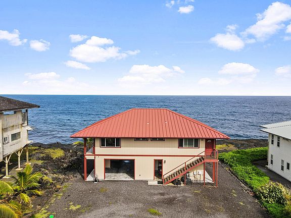 The home’s elevated design allows for sweeping, unobstructed views of the Pacific, creating a postcard-perfect backdrop from EVERY room. Relax or entertain on the spacious wrap-around lanai, ideal for soaking up the sunrise, watching whales, turtles, dolphins and the Noddy birds or enjoying the soothing ocean breeze. The open-concept living area boasts vaulted ceilings and sliding glass doors, filling the home with natural light and seamless indoor-outdoor flow. Both bedrooms offer serene ocean views and attached bathrooms with large walk in tiled showers. The post & pier elevated structure adds additional storage or workshop space below. This property sits on a private lot with low-maintenance landscaping and direct access to Hawaii's rugged and beautiful lava coastline. Enjoy the soothing sounds of waves crashing against the shore as you unwind in your own tropical oasis.