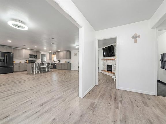 Stacked stone fireplaceShaker-style cabinetryCenter islandUpdated lighting fixturesSolid surface countertopsLarge windowsCustom tilework