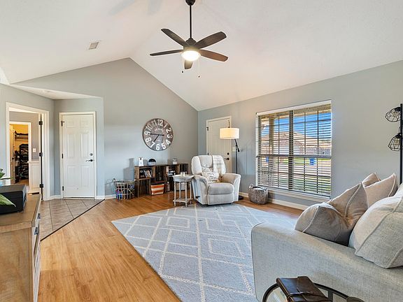 Primary en suiteLarge walk-in closetSplit floor planOversized covered patioVaulted ceilingLarge fully fenced backyardFront porch swing