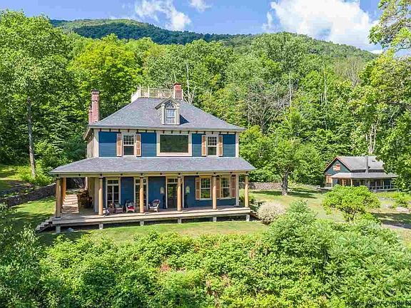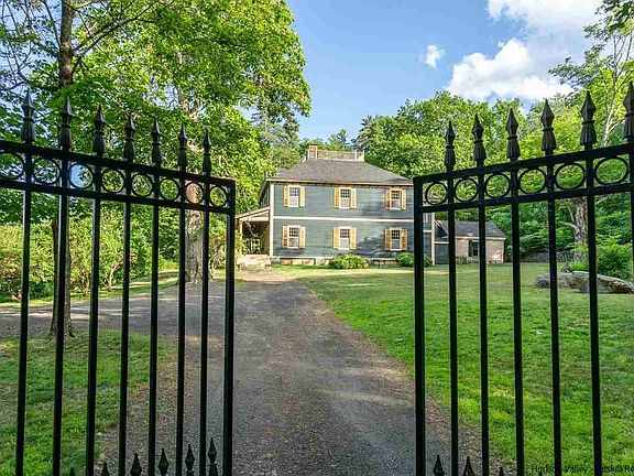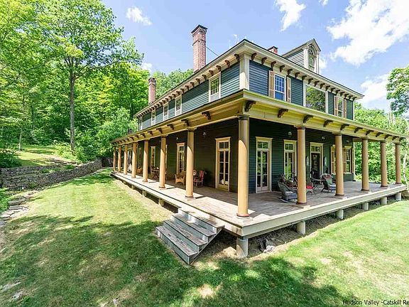 The Mountain House is like no property this veteran agent has ever seen. Sited on 26 uber-private acres and surrounded by state land, the home itself is accessed by a quarter-mile driveway through the woods and enjoys sweeping mountain views to the northeast and 800 feet of frontage and a waterfall on the Cold Spring Brook, a tributary of the Esopus Creek. The proportions of the house are grand, with 120 feet of columned porches, 12-foot ceilings and spacious rooms, yet there's no pretense here; this is a humble mountain retreat that offers plenty of relaxed space for family and friends. Many of the first floor walls and ceilings are clad in pressed tin, various ceilings are coffered or adorned with intricate plaster moldings, and original woodwork and floors are in chestnut and Douglas fir. There are multiple places to both gather and seek solitude - morning room, living room, billiard room, casual and formal dining rooms, the rooftop widow's watch, as well as plenty of spots on the rambling property that beckon. Bedrooms are all spacious, and the walk-up attic offers an opportunity to create yet another place to tuck away. The rear, brick portion of the home perhaps predates the construction of the clapboard-clad structure. Extensive renovations were undertaken by the current owners and include new systems, siding and insulation, and it was important to them to retain the aesthetic of the old while installing the new. A separate studio/guest cottage sits across the lawn, and is ripe for an interior renovation. An easy trail from The Mountain House leads to the rear boundary of the property, where the deck over the brook offers the most romantic and serene spot to get even farther away from the world. That said, the Emerson Resort and Spa and Foxfire Mountain House offer dining and recreation within walking distance, and the town of Phoenicia, Bellayre Ski Center and loads of other attractions are nearby.